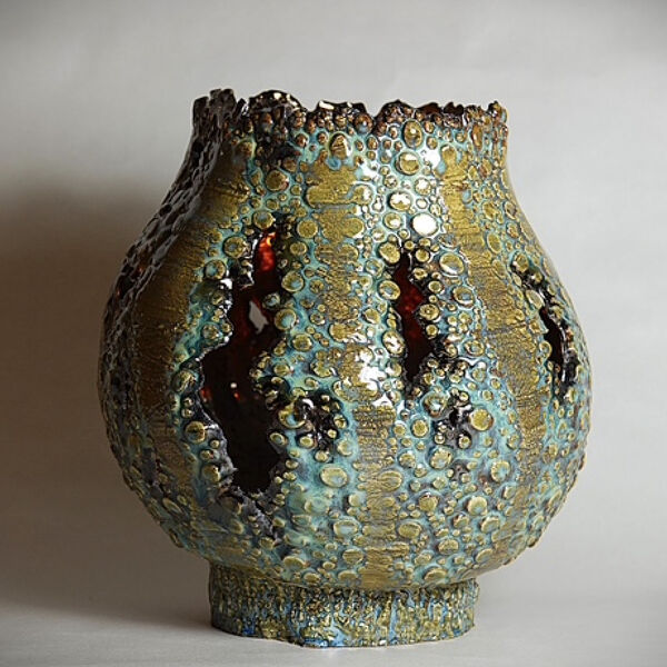 From an early age, I have always been fascinated by dramatic textures and colour tones in nature, and this consistently comes through in my work. I use toasted stoneware clay and then add textures from natural objects such as rocks and shells, as well as from plastic items sadly washed ashore, evoking the sense of a once-beautiful pot lifted from the seabed after many years. Over several days, I encourage the clay body to split and crack using different heat treatments. The glaze layers then create crystalline surfaces, crawling effects, lava-like eruptions, and finishes with depth, light and an irresistible urge to touch.